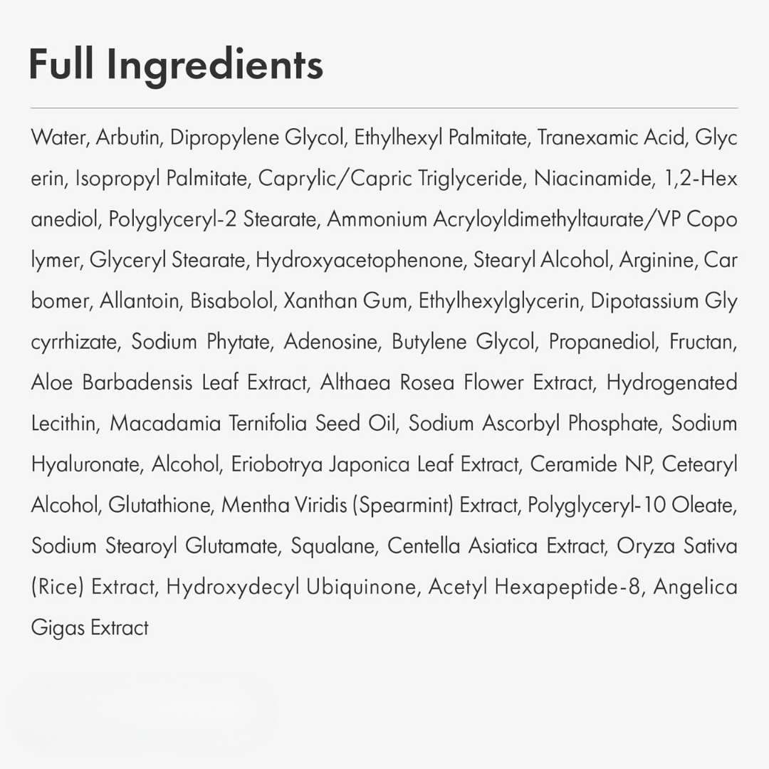 With powerful ingredients like Arbutin and Tranexamic Acid, it promotes a visibly brighter complexion while reducing the appearance of dark spots, freckles, and discoloration.