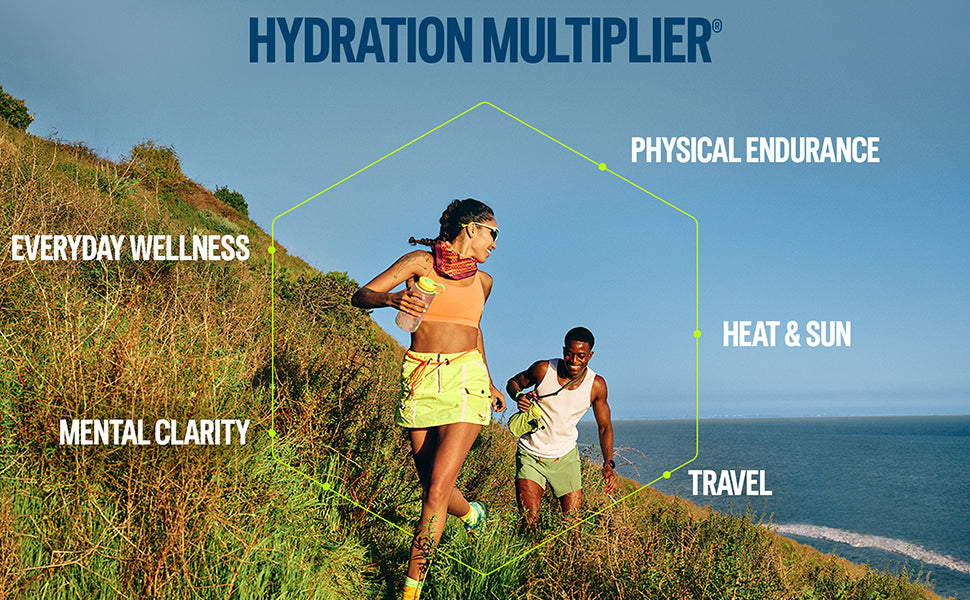 Hydration Multiplier works by delivering hydration faster than water alone, using a unique blend of electrolytes and vitamins. It helps replenish fluids quickly and support electrolyte balance to keep you feeling energized and refreshed.