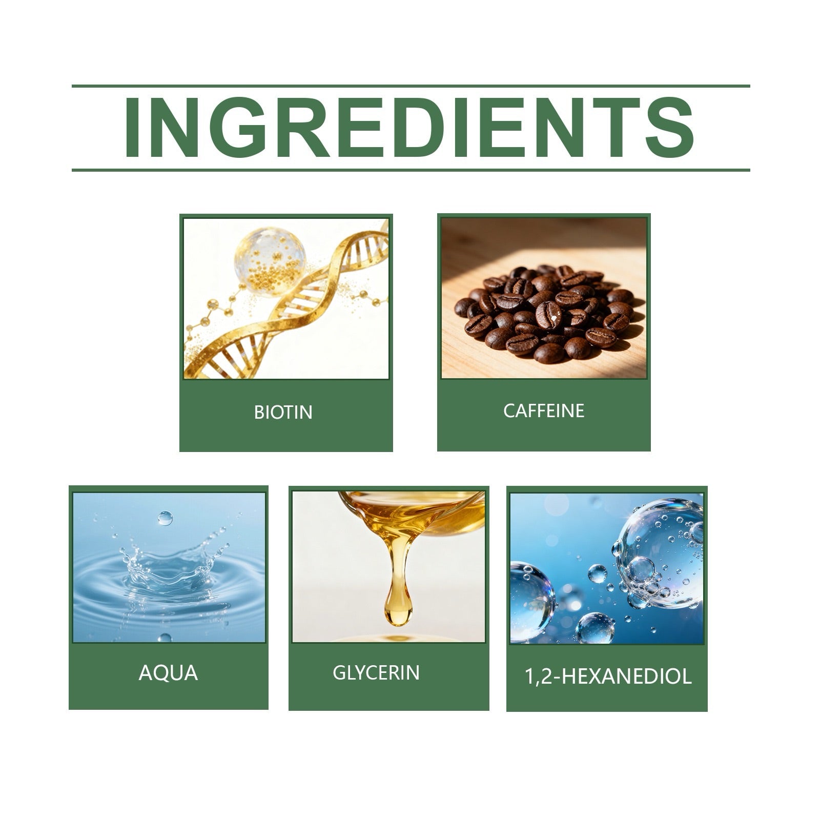 Biotin strengthens hair follicles, while Caffeine energizes the scalp and boosts circulation to encourage healthy hair growth. Glycerin locks in moisture, keeping hair hydrated and manageable.