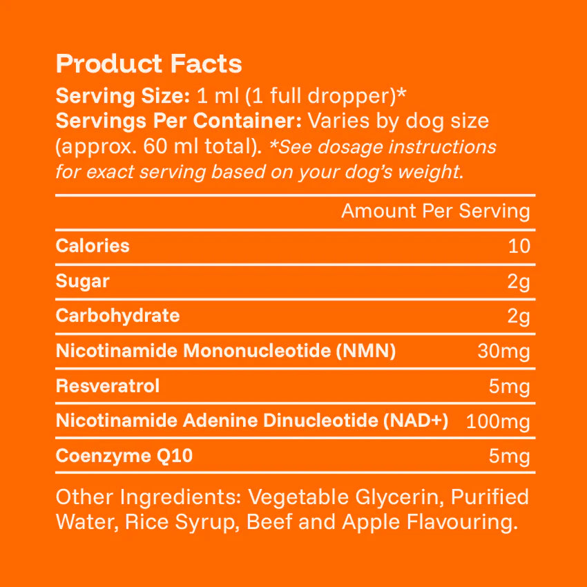 The final step is all about long-term wellness. As your dog ages, their ability to repair damaged cells and bounce back from stress starts to fade. But ingredients like NMN and NAD+ help restore that process, giving their body the tools it needs to recover as in their younger years. This means better energy, fewer aging signs, and a greater chance at a longer, healthier life - setting them up for a future filled with tail wags, belly rubs, and happy moments by your side.